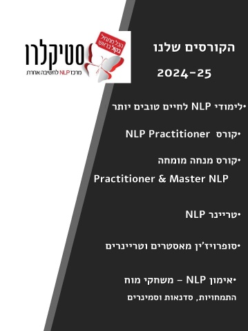 הקורסים שלנו 2024-25 •לימודי NLPלחיים טובים יותר •קורס NLP Practitioner •קורס מנחה מומחה Practitioner & Master NLP •טריינר NLP •סופרויז'ין מאסטרים וטריינרים •אימון – NLPמשחקי מוח התמחויות ,סדנאות וסמינרים